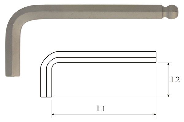 Характеристика: Сталь: Cr-V-Mo (S2) Обработка: полирование Покрытие: дробеструйная обработка Конфигурация: Г-образный, стандартный, с шаровидным наконечником Габаритные размеры: L1=77мм, L2=14мм
