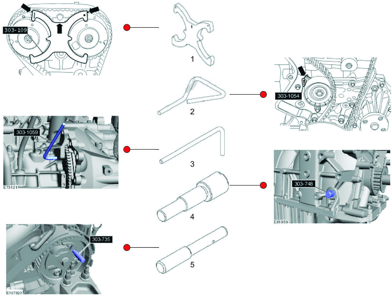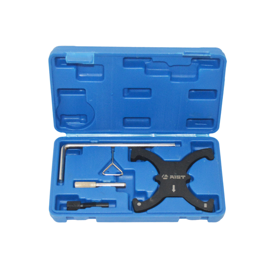 Применение набора инструмента для фиксации распредвала на Ford 1.6 Duratec Ti-VCT: Набор инструментов Форд с фиксатором "бабочка" 303-1097 для фазовращателей распредвалов специально разработан для замены ремня ГРМ на автомобилях FORD/VOLVO с двигателями 1.6 литров и двумя фазавращателями Ti-VCT Duratec 16V и Ecoboost 16V, например, используется для бензиновых Форд Фокус 2 и 3 объемом 1.5/1.6 литра. Фиксатор Форд "бабочка" (FORD 303-1097) используется только для блокировки от вращения распределительных валов при замене ремня ГРМ. "Бабочка" не используется для затяжки/откручивания болтов крепления шестерен. Набор фиксаторов распредвала для установки фаз ГРМ FORD/VOLVO поставляется в кейсе. Набор фиксаторов ГРМ Форд для замены ремня ГРМ на Форд Фокус 2 и 3. Некоторые фиксаторы применимы к двигателям Ford 1.6 Duratorq TDCI и 2.0 TDCI. С помощью данного набора можно без проблем выставить фазы ГРМ, избегая повторных разборок и регулировок. Профессиональный набор фиксаторов FORD 1.6 Duratec Ti-VCT. Для откручивания болтов шестерен и фазавращателей используется специальный фиксатор (пластина) распредвалов из набора - 67230532 и ключ контропора. Для фиксации маховика коленвала существует специальный фиксатор - 67230528. Подходит для: Ford: 1.6 TI-VCT Duratec код двигателя: HXJA, HXJB, HXDA, HXDB, IQDA, IQDB, PNBA, PNDA, RHBA, SIDA. (мощность: 105, 110, 115, 120 и 125 л.с) Ford 2.0 TDCI дизельный код двигателя: G6DA, G6DB, G6DC, AZBA, QXBA Ford 1.6 TI-VCT Duratec: Fiesta, Focus 2, Focus 3, Focus C-Max, Mondeo, Ecosport и другие модели Volvo: 1.6 GTDi (T3 и T4) - бензиновые двигатели с турбо нагнетателем и непосредственным впрыском топлива. Volvo: S60, S80, V60, V70 Ford 2.0 TDCI Ford: 1.5/1.6 EcoBoost (для двигателей ecoboost 1.6 при регулировке фаз ГРМ дополнительно нужно приобрести регулировочный инструмент для демпфера вибрации коленчатого вала 303-1550); Комплектация набора: 1 - Фиксатор фазорегуляторов "бабочка" FORD 303-1097/303-109/999-7429/9997429; 2 - Фиксатор плунжера натяжителя ремня ГРМ FORD 303-1054. 3 - Стопор маховика FORD 303-1059 (используется для двигателя 2.0 TDCI); 4 - Фиксатор коленвала FORD 303-748 (резьба M10); 5 - Фиксатор шестерни распредвала FORD 303-735 (используется для двигателей Duratorq 1.6 TDCI и 2.0 TDCI).