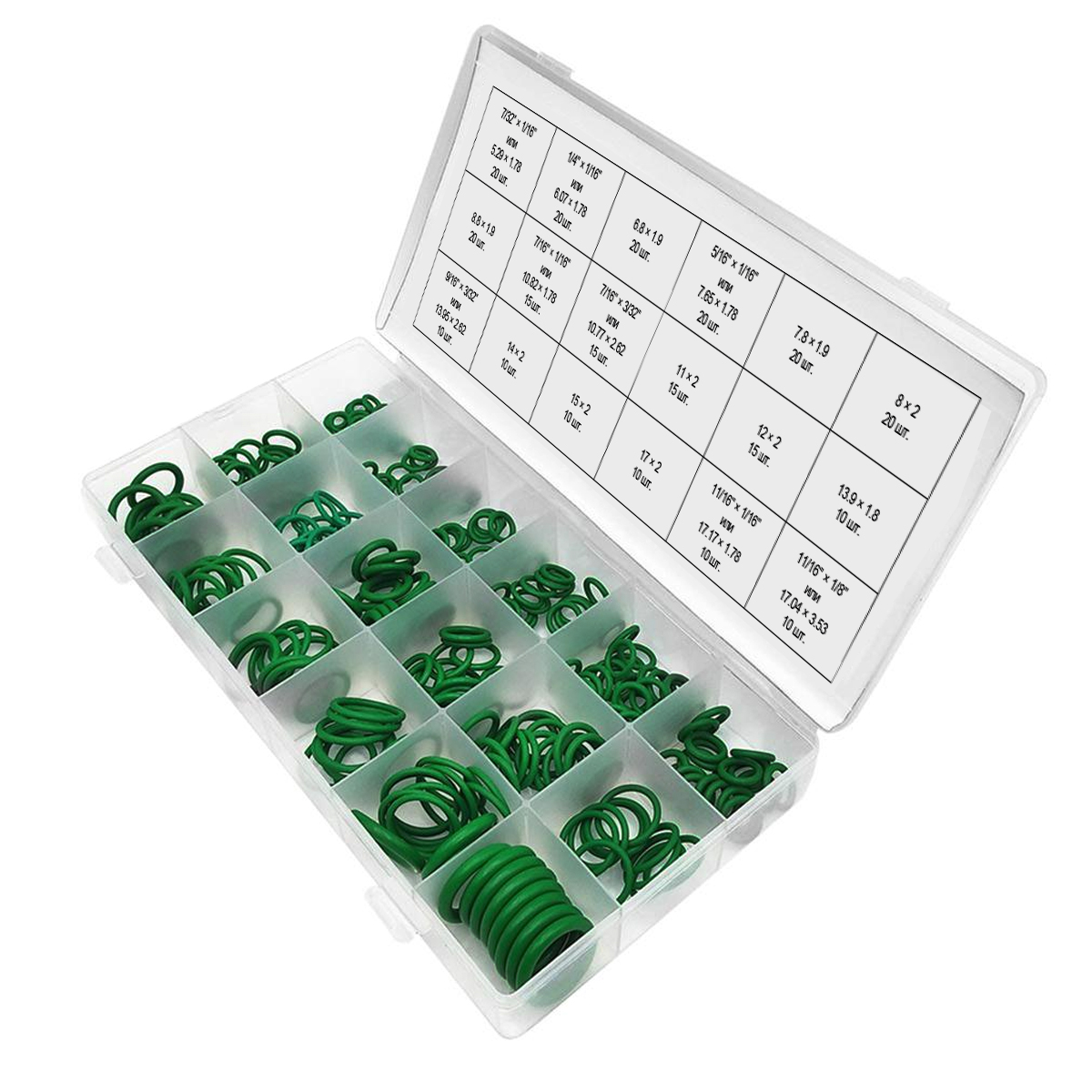Набор уплотнительных колец 265 шт. используются в качестве расходных материалов при ремонте и обслуживанию систем кондиционирования автомобилей, использующих хладагенты марок R-12 и R-134A. Комплектация - 4.80*1.50 - 20 шт. - 6.07*1.78 - 15 шт. - 6.80*1.90 - 10 шт. - 7.80*1.90 - 20 шт. - 8.00*2.00 - 20 шт. - 8.80*1.90 - 15 шт. - 9.25*1.78 - 20 шт. - 9.80*1.90 - 15 шт. - 10.00*2.00 - 10 шт. - 10.77*2.62 - 10 шт. - 10.82*1.78 - 10 шт. - 11.00*2.00 - 20 шт. - 12.42*1.78 - 20 шт. - 13.80*1.90 - 10 шт. - 14.00*2.00 - 20 шт. - 15.54*2.62 - 10 шт. - 15.70*1.78 - 10 шт. - 17.17*1.78 - 10 шт.